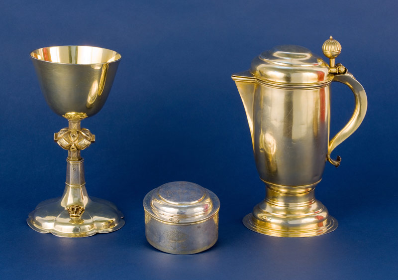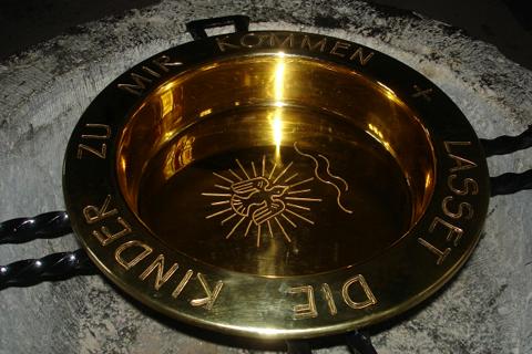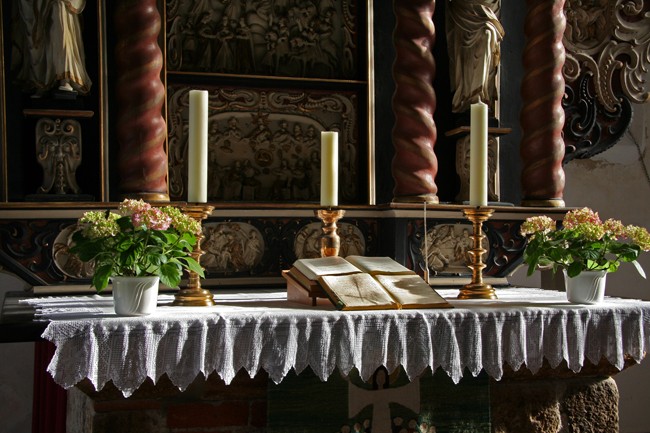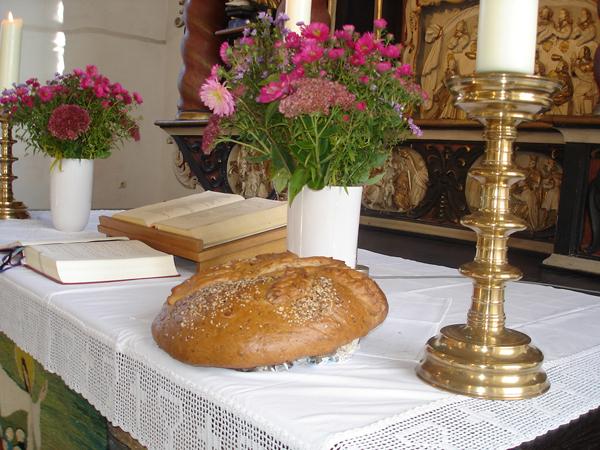 Am ersten Sonntag im Monat feiern wir Abendmahl in einem großen Halbkreis vor dem Altar. Im Kelch ist immer Traubensaft.